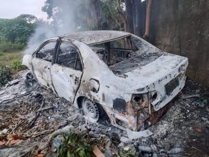 Um carro foi totalmente consumido pelo fogo na noite desta terça-feira (22), em uma área de mata fechada próxima ao