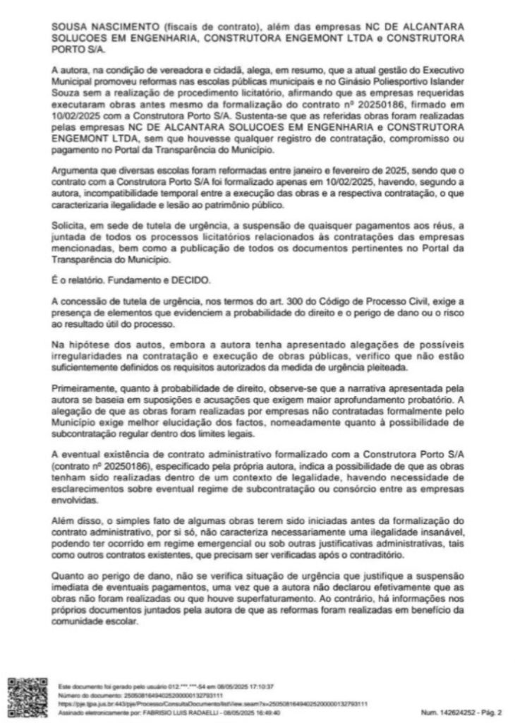 A parlamentar afirma que os serviços foram executados por empresas NC de Alcântara Soluções em Engenharia, Construtora Engemont Ltda e Construtora Porto S.A. antes da assinatura do contrato administrativo nº 20250186, celebrado apenas em 10 de fevereiro de 2025. Segundo ela, não havia, à época, nenhum registro público dessas contratações, configurando possível dano ao erário e violação dos princípios administrativos, como legalidade, publicidade e moralidade.