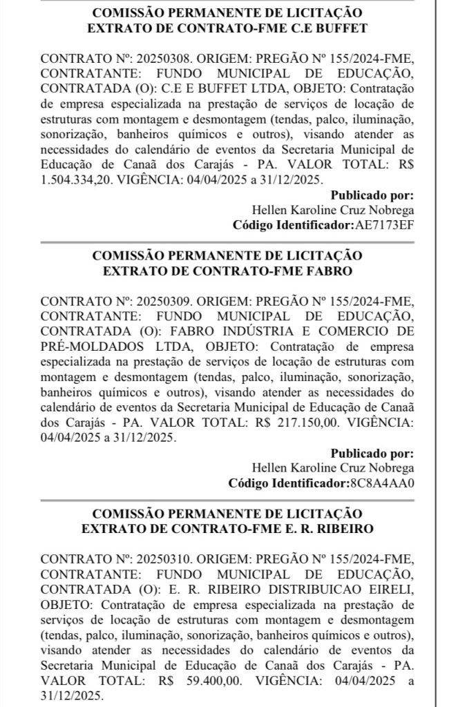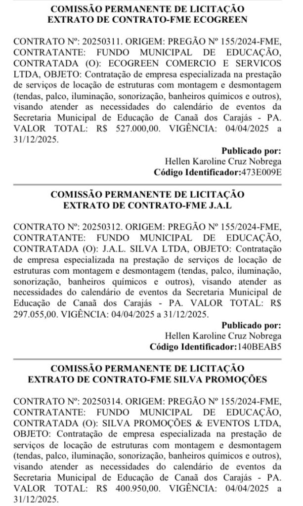A Prefeitura de Canaã dos Carajás, por meio do Fundo Municipal de Educação, assinou ao menos seis contratos com empresas privadas para locação de estruturas para eventos escolares, como palcos, tendas, iluminação, sonorização e banheiros químicos. Os extratos foram publicados oficialmente e totalizam R$ 3.505.239,20, com vigência de abril a dezembro de 2025.