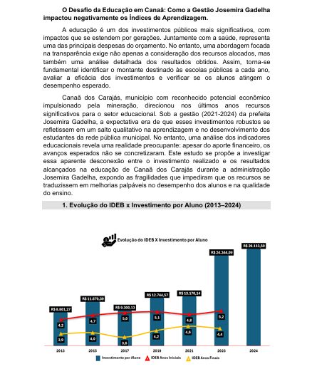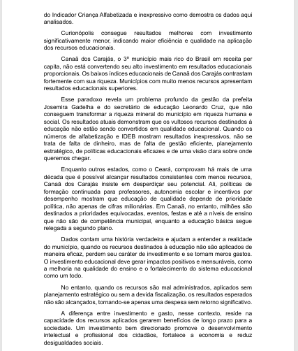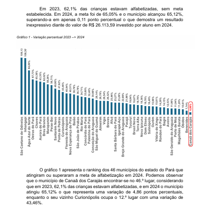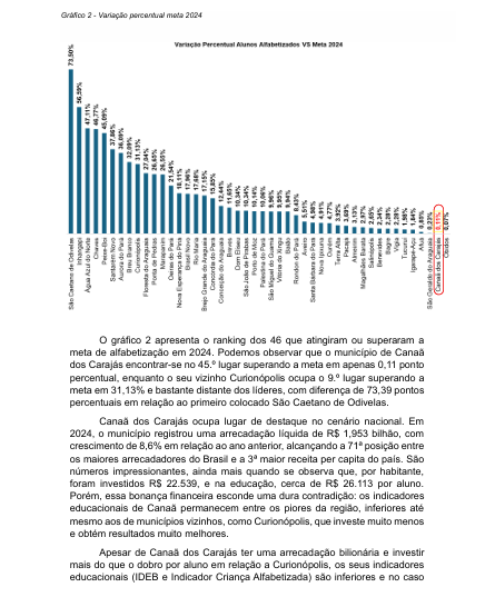 Canaã dos Carajás aparece nas propagandas oficiais como exemplo de avanço educacional, estampando que superou a meta do Compromisso Nacional Criança Alfabetizada. Mas basta confrontar os números para perceber que se trata de pura maquiagem midiática. O município, que ostenta a 3ª maior receita per capita do Brasil, investiu mais de R$ 26 mil por aluno em 2024, mas conseguiu superar a meta por apenas 0,11 ponto percentual – um resultado inexpressivo, que rendeu à cidade a 45ª posição no ranking do Pará, atrás de municípios muito mais pobres, como Curionópolis.