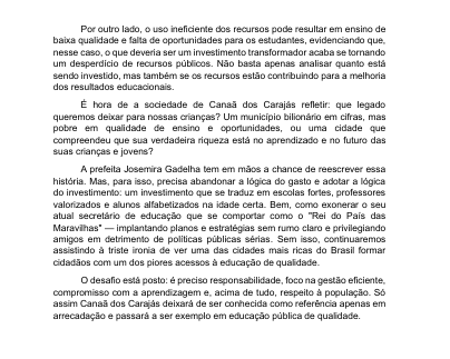 O fracasso da educação em Canaã dos Carajás tem nome e sobrenome: Josemira Gadelha. Ao preferir temporários e comissionados a concursados por mérito, a prefeita transforma a rede pública em um reduto de interesses políticos e cabides de emprego. A maquiagem nos índices pode enganar em propaganda, mas não esconde a realidade: alunos com desempenho cada vez pior, professores desmotivados e uma cidade rica que insiste em ser pobre em educação.
