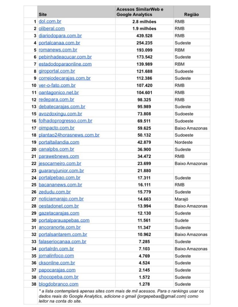A lista, organizada pelo jornalista Jorge Clésio e publicada no site jorgeclesio.com.br, contempla apenas sites com mais de mil acessos mensais, com base nos dados da plataforma SimilarWeb.