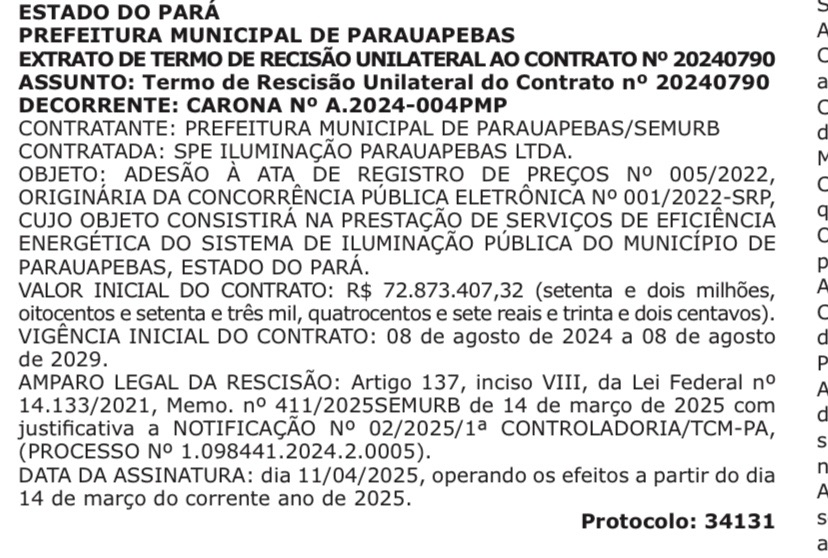 A Prefeitura Municipal de Parauapebas publicou o extrato do termo de rescisão unilateral do contrato, firmado com a empresa SPE Iluminação Parauapebas LTDA, que previa a prestação de serviços voltados à eficiência energética do sistema de iluminação pública do município.