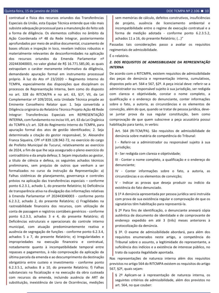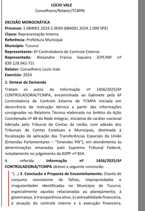 O Tribunal de Contas dos Municípios do Pará (TCMPA) acaba de abrir uma representação interna contra o prefeito de Tucuruí, Alexandre França Siqueira (MDB), por graves irregularidades na aplicação de R$ 16,77 milhões em recursos de emendas parlamentares especiais (as famosas “emendas PIX”) destinadas ao município em 2024.