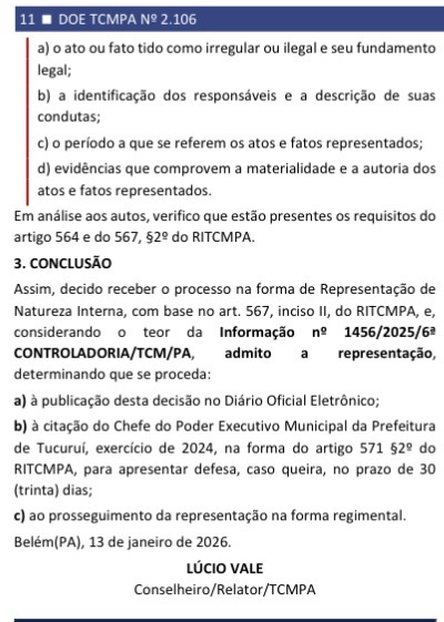 Diante disso, o conselheiro determinou a citação imediata do prefeito Alexandre França Siqueira para apresentar defesa em até 30 dias, sob pena de prosseguimento do processo sem sua manifestação. A representação interna foi admitida com base no Regimento Interno do TCMPA (arts. 567 e seguintes), e o processo seguirá tramitação regimental, com possível aprofundamento das apurações e aplicação de sanções.