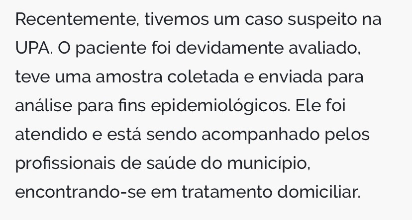 Segundo a Semsa, o paciente foi prontamente atendido por profissionais de saúde, teve amostras coletadas para exame laboratorial e segue sendo monitorado enquanto permanece em tratamento domiciliar, em isolamento preventivo.