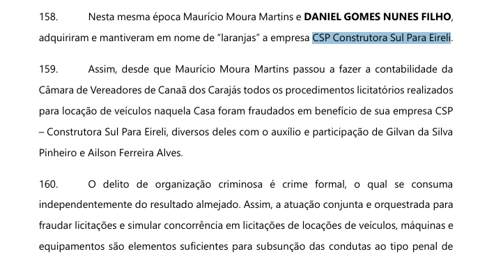 A CSP surge como peça central no “núcleo empresarial” da organização criminosa, segundo a denúncia. Fundada em 2019, a empresa é descrita como controlada por “laranjas” – pessoas interpostas para ocultar os verdadeiros donos. Especificamente, o contador Maurício Moura Martins, integrante do núcleo técnico do esquema, e Daniel Gomes Nunes Filho são apontados como sócios ocultos da CSP. Eles teriam adquirido a empresa para fraudar licitações, especialmente no segmento de locação de veículos e construção civil.