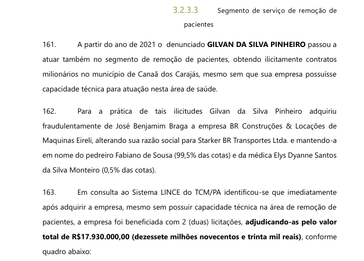 Trecho da denúncia de 132 páginas do MPPA, conduzida pelo GAECO, que detalha um esquema de corrupção em Canaã dos Carajás.