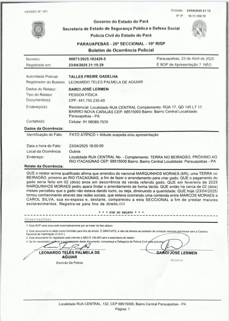 Ao formalizar sua versão na 20ª Seccional Urbana de Polícia Civil, Darci esclareceu que sua ligação direta com a fazenda se restringe ao arrendamento firmado anteriormente com Marquinhos M5. “Estava ocorrendo uma contenda entre Marcos Moraes e Carol Silva, minha ex-esposa”, relatou.