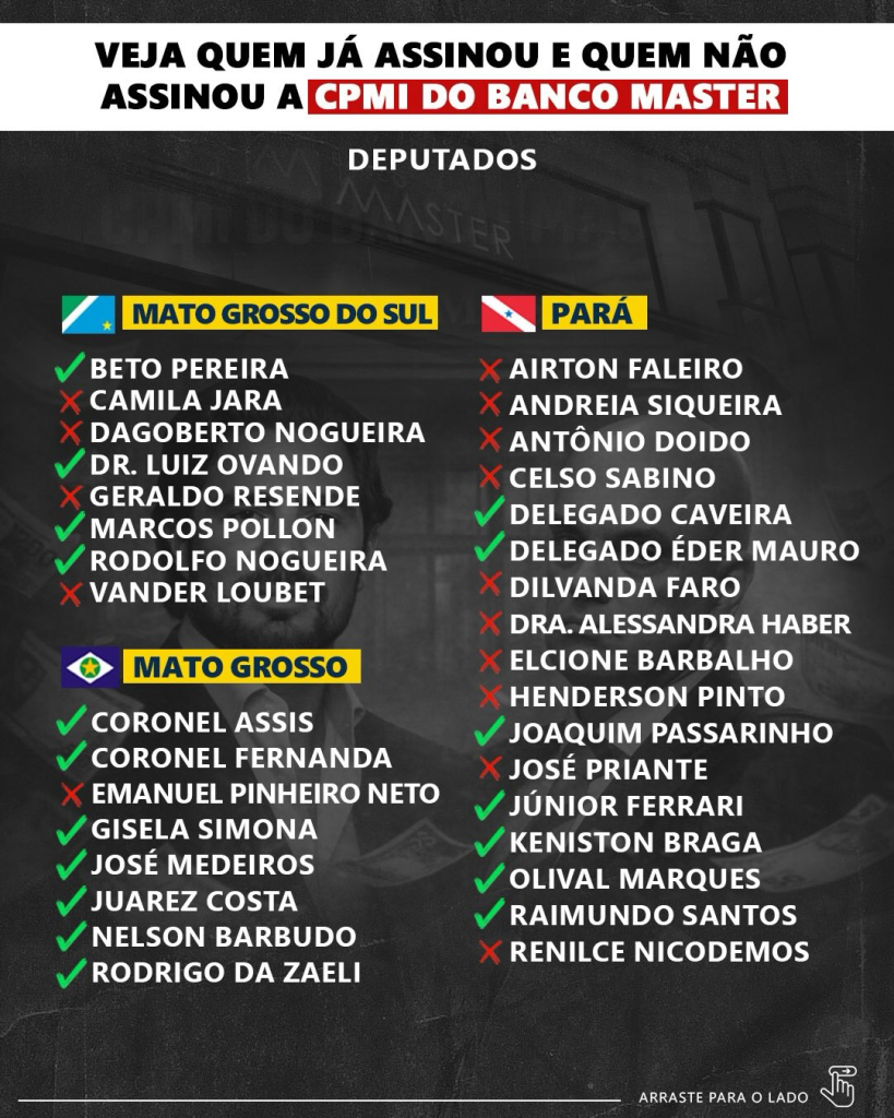 A deputada Andreia Siqueira (MDB) optou por não assinar o pedido de criação da CPMI do Banco Master, que busca investigar suspeitas graves envolvendo o Banco Master e sua relação com decisões financeiras e institucionais que impactam diretamente o dinheiro público.