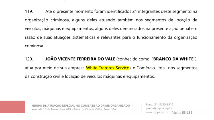 A WHITE TRATORES pertence ao empresário João Vicente Ferreira do Vale, conhecido como “Branco da White”. O nome não é desconhecido das autoridades. Ele aparece em documentos oficiais do GAECO/MPPA como integrante do núcleo empresarial de uma organização criminosa investigada em Canaã dos Carajás, com atuação em fraudes licitatórias, contratos direcionados, medições fraudulentas e cobrança de propina entre 6% e 10% sobre contratos públicos.