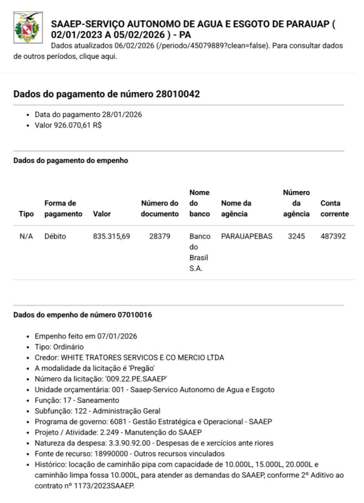 Somente em janeiro de 2026, em 27 dias úteis, a gestão municipal pagou R$ 926.070,61 à empresa WHITE TRATORES SERVIÇOS E COMÉRCIO LTDA, conforme dados oficiais de empenho, liquidação e pagamento realizados pelo SAAEP – Serviço Autônomo de Água e Esgoto de Parauapebas.