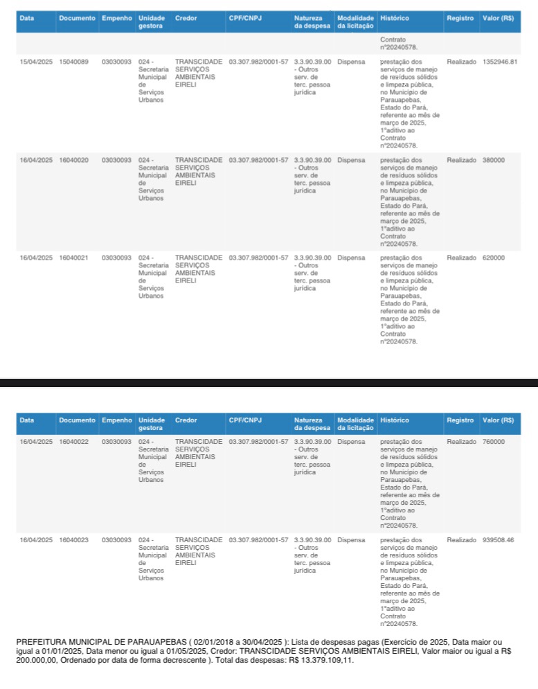 O documento oficial, obtido com exclusividade, detalha valores expressivos pagos mensalmente pela prestação dos serviços de manejo de resíduos sólidos e limpeza pública. Em fevereiro, por exemplo, foram R$ 4.780.401,44. Em janeiro, outros R$ 3.956.252,40. Já em abril, os pagamentos referentes a março foram fragmentados em diversas ordens bancárias, totalizando mais de R$ 3 milhões.