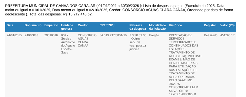 O documento de despesas da Prefeitura de Canaã dos Carajás mostra que o Consórcio Aguas Clara Canaã (CNPJ 54.619.737/0001-16) recebeu um total de R$ 15.212.443,52 em pagamentos entre 1º de janeiro e 2 de outubro de 2025. A empresa foi criada em agosto de 2024 e, de acordo com a denúncia, se tornou a maior prestadora de serviços do SAAE.