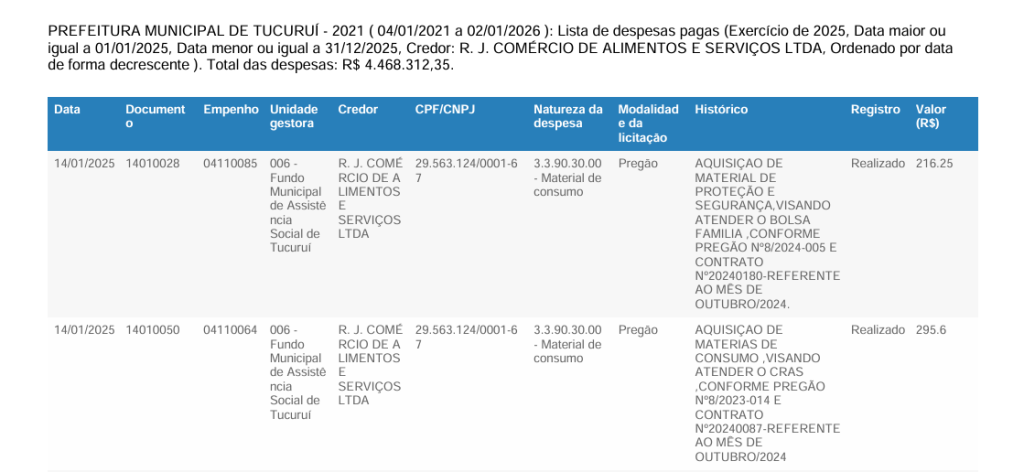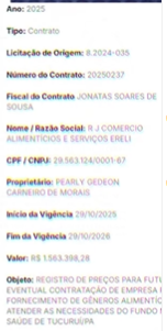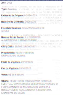 Documentos oficiais de despesas públicas mostram que a RJ Comércio de Alimentos e Serviços LTDA, ligada a Pearl Gedeon Carneiro de Moraes, já recebeu mais de R$ 18 milhões dos cofres municipais entre 2021 e 2025.