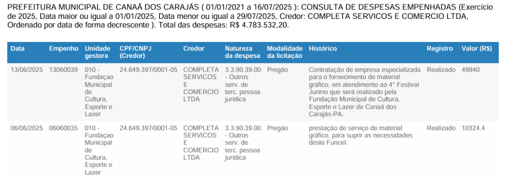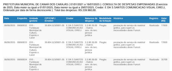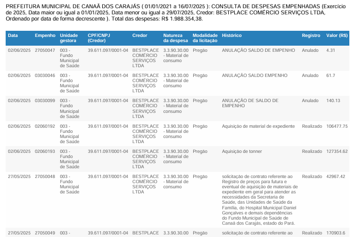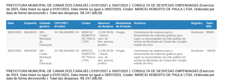 Todos os valores foram extraídos diretamente dos documentos públicos de despesas pagas e empenhadas pela Prefeitura de Canaã Dos Carajás. Os arquivos utilizados nesta apuração foram: