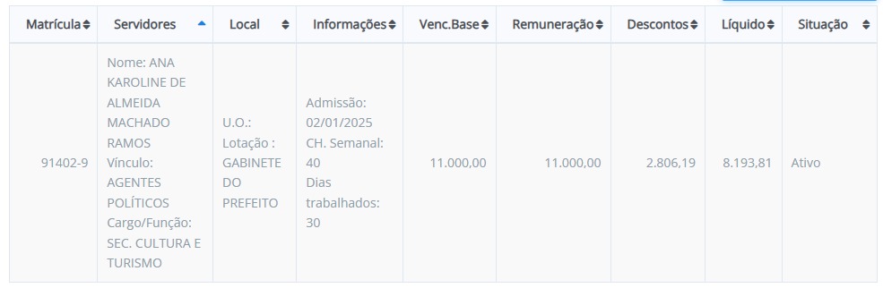 Segundo os dados da folha de pagamento, Ana Karoline teve lançados 30 dias trabalhados e recebeu salário líquido de R$ 8.193,81, mesmo constando matriculada em uma instituição localizada a mais de 200 quilômetros de distância de seu suposto local de trabalho. A carga horária prevista em sua função é de 40 horas semanais, o que exigiria presença diária em repartições do município.