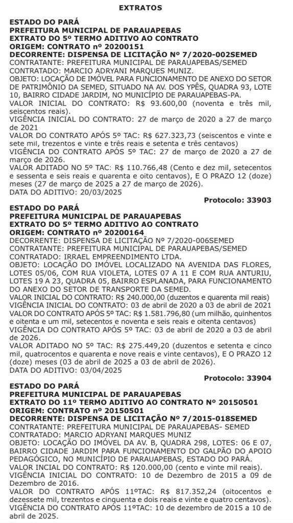 Enquanto a população de Parauapebas enfrenta desafios em áreas como saúde e infraestrutura, a Prefeitura segue ampliando gastos milionários com aluguéis de imóveis usados pela Secretaria Municipal de Educação (SEMED). Três novos termos aditivos publicados recentemente no Diário Oficial revelam que os contratos, muitos em vigor há anos, continuam sendo prorrogados e reajustados, elevando significativamente o custo aos cofres públicos.