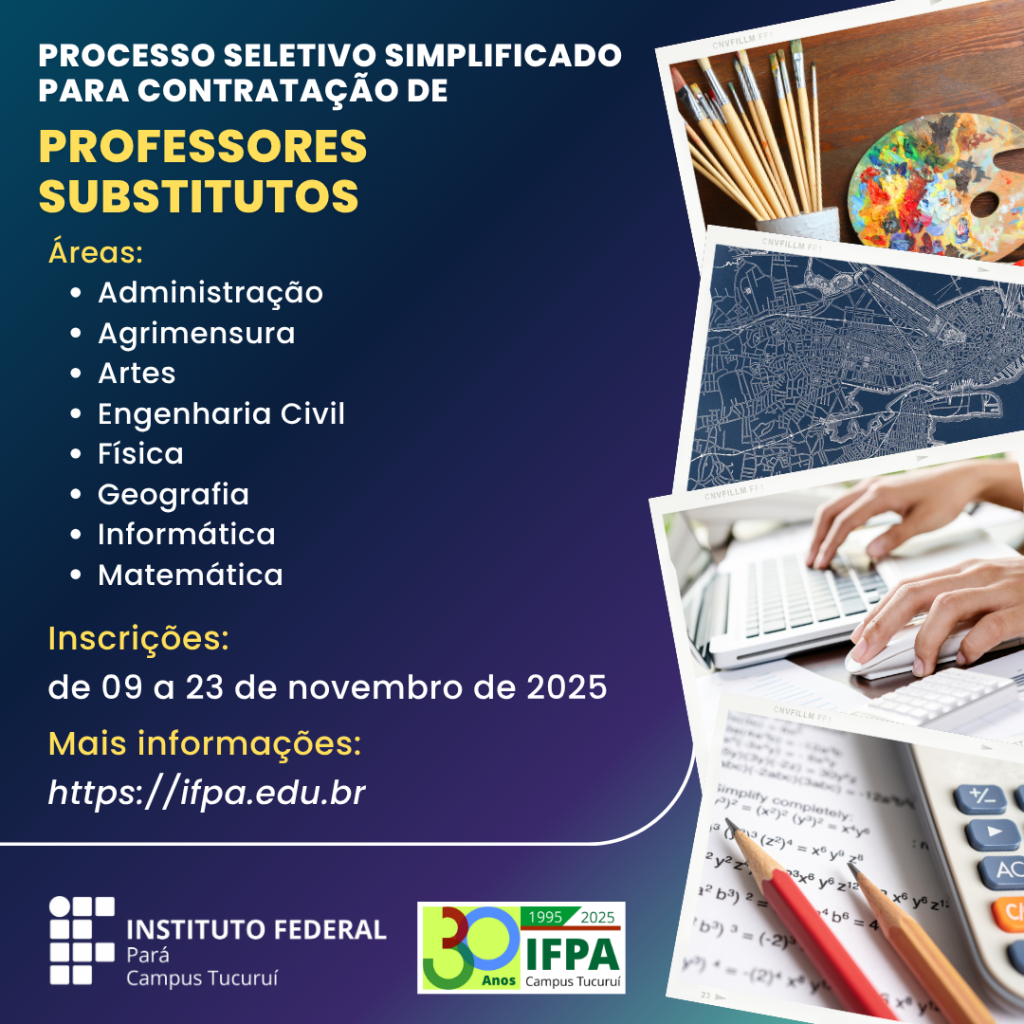 O Instituto Federal de Educação, Ciência e Tecnologia do Pará (IFPA), Campus Tucuruí, publicou o Edital nº 12, de 5 de novembro de 2025, dando início ao Processo Seletivo Simplificado (PSS) para a contratação de Professor Substituto em caráter temporário, visando atender à necessidade excepcional da instituição.