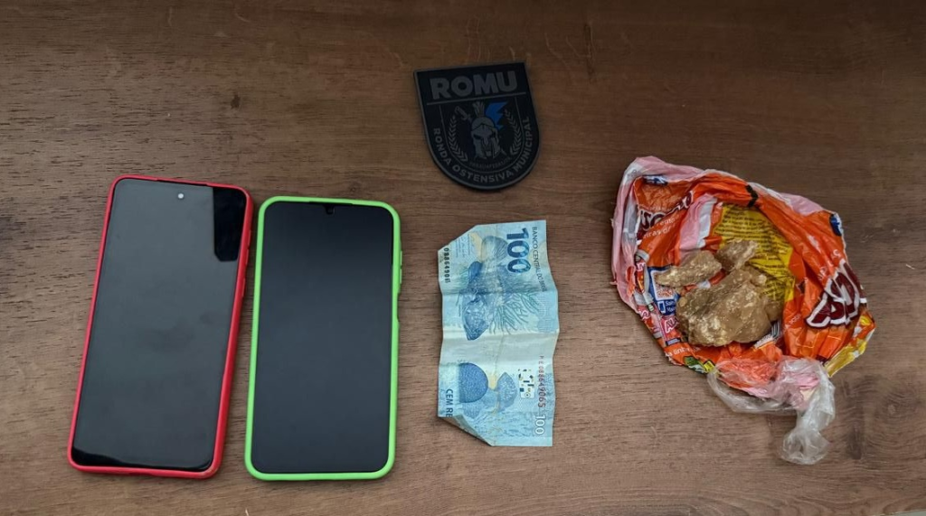 A equipe da ROMU realizou o acompanhamento tático e conseguiu abordar a dupla momentos depois. Durante a busca pessoal, os agentes encontraram com G.M.R. uma embalagem plástica contendo uma substância análoga ao crack, além de R$ 100,00 em espécie e um aparelho celular.