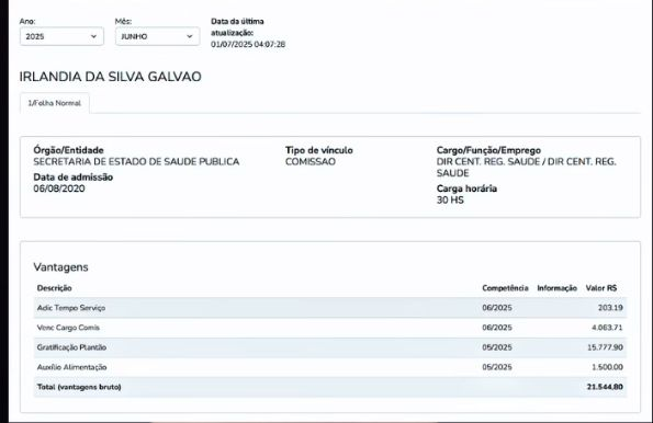 Do outro lado, ela exerce um cargo comissionado como diretora do 11º Centro Regional de Saúde da SESPA, com sede em Marabá, a mais de 300 km de distância de Tucuruí. Esse cargo, por si só, exige 30 horas semanais de dedicação presencial. Mas os valores recebidos impressionam ainda mais: em junho de 2025, os proventos pagos pelo Estado somaram R$ 21.544,80, sendo R$ 15.777,90 apenas em gratificações por plantões.