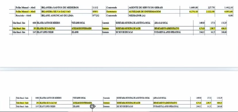 De um lado, Irlândia é servidora efetiva da Prefeitura de Tucuruí, ocupando o cargo de Auxiliar de Enfermagem, função que exige presença regular e dedicação. Somente no mês de junho de 2025, ela recebeu R$ 6.274,00 líquidos da prefeitura, conforme consta na folha de pagamento.
