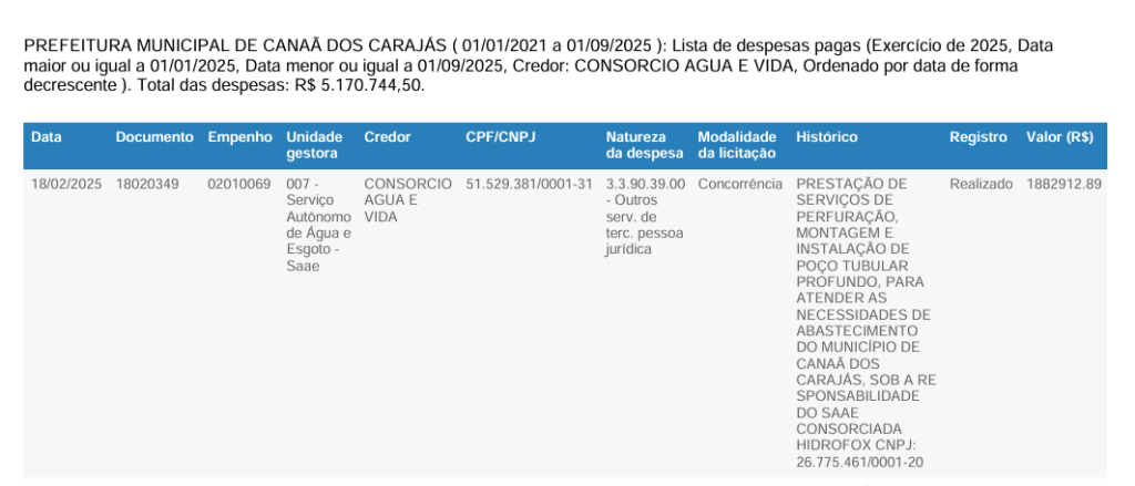 - Consórcio Água e Vida: Gastou um total de R$ 49.633.312,59 em serviços de perfuração, montagem e instalação de poços tubulares profundos para abastecimento de água.