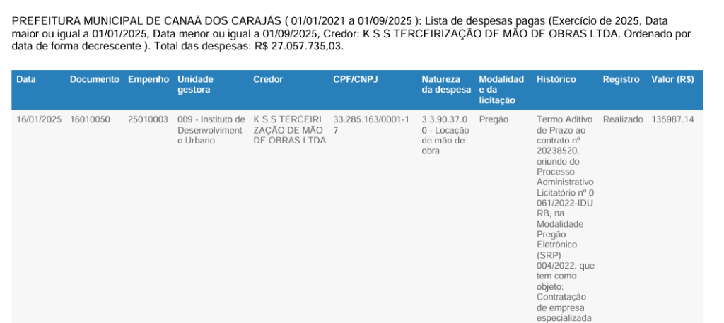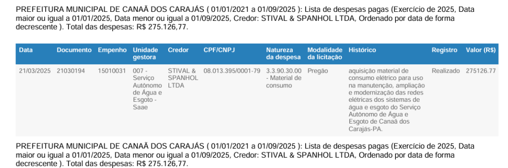 Fonte: Lista de despesas pagas pela Prefeitura Municipal de Canaã dos Carajás.