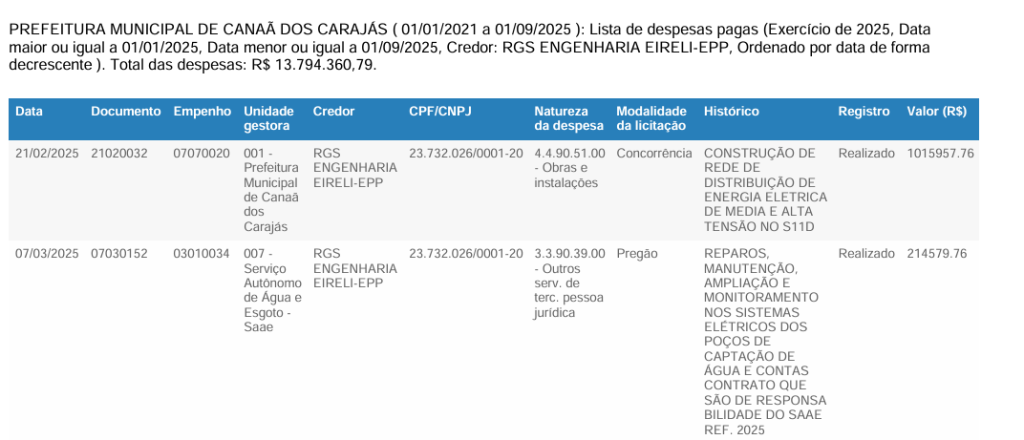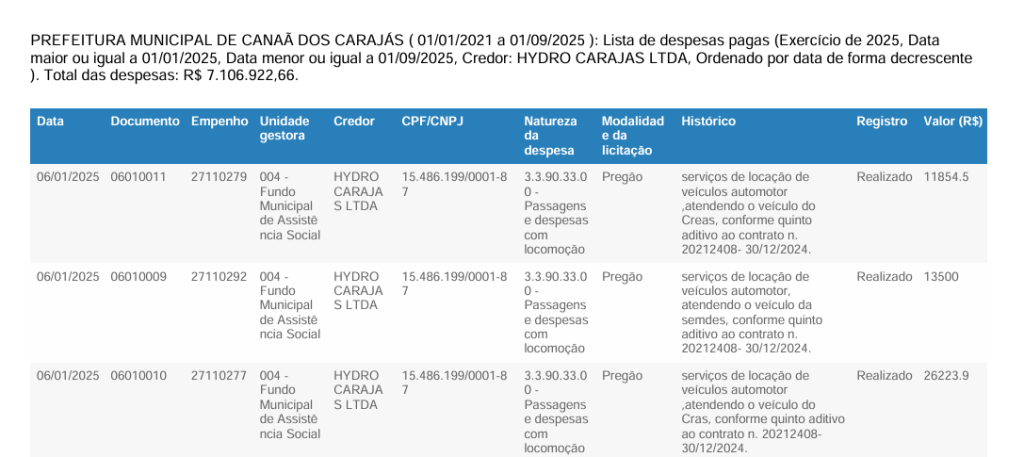 - Hydro Carajás Ltda.: A locação de máquinas pesadas para o SAAE gerou uma despesa de R$ 16.634.836,56 para a gestão.