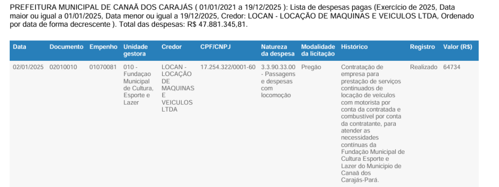 - LOCAN – LOCAÇÃO DE MAQUINAS E VEICULOS LTDA: R$ 47.881.345,81 – Foco em veículos para fundações de cultura, esporte e lazer, com motoristas e combustível por conta da contratante.