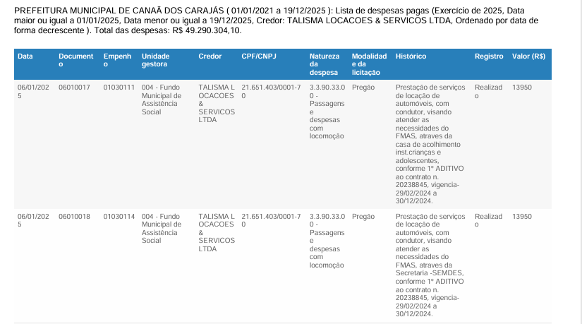 - TALISMA LOCACOES & SERVICOS LTDA: R$ 49.290.304,10 – Contratos para locação de automóveis com condutor, atendendo fundos municipais de assistência social.
