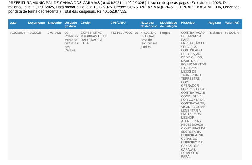 - CONSTRUFAZ MAQUINAS E TERRAPLENAGEM LTDA: R$ 40.552.877,55 – Locação de máquinas pesadas para obras, ironicamente enquanto ruas urbanas deterioram.