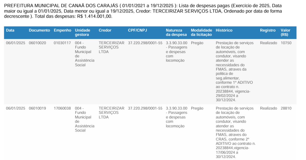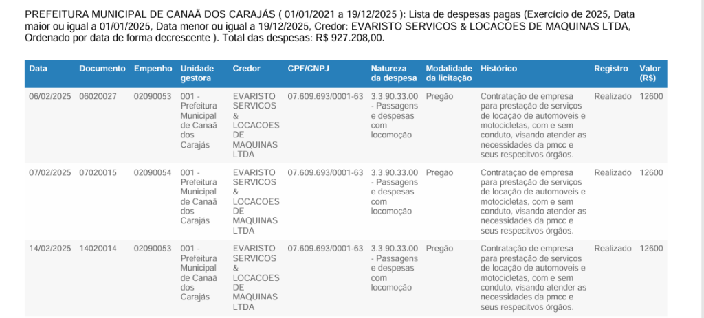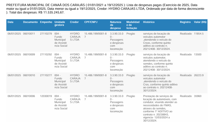 - HYDRO CARAJAS LTDA: R$ 11.535.245,67 – Contratos para assistência social, incluindo veículos para CRAS e CREAS.