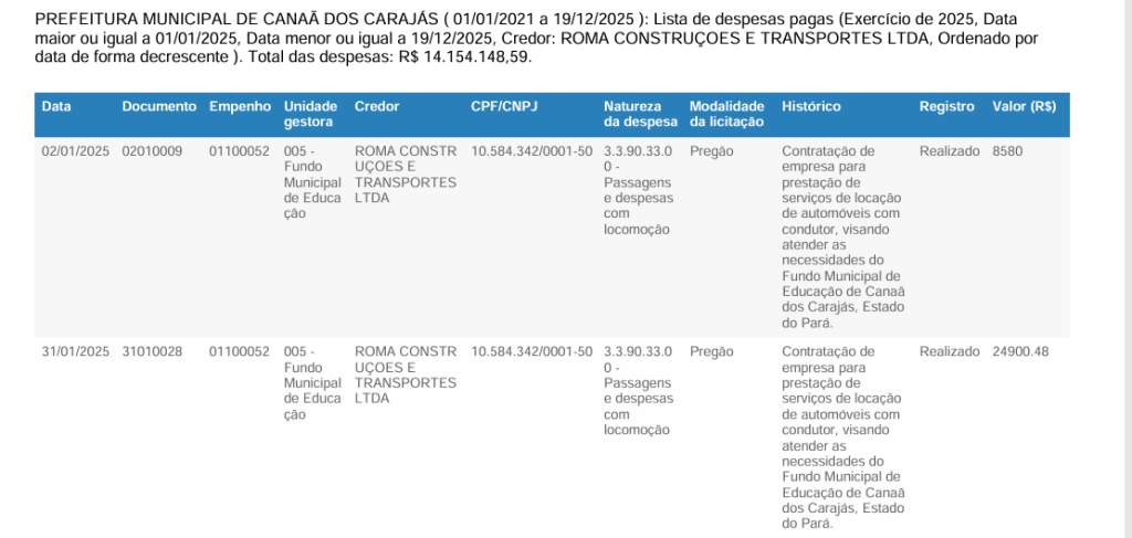 - ROMA CONSTRUÇOES E TRANSPORTES LTDA: R$ 14.154.148,59 – Principalmente para educação, com pagamentos mensais que somam dezenas de milhares.
