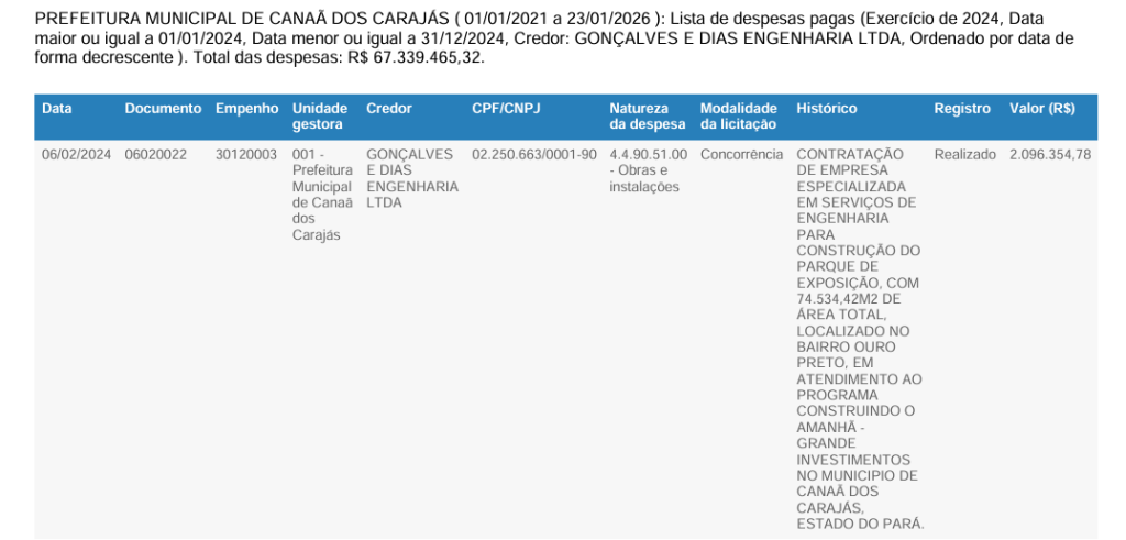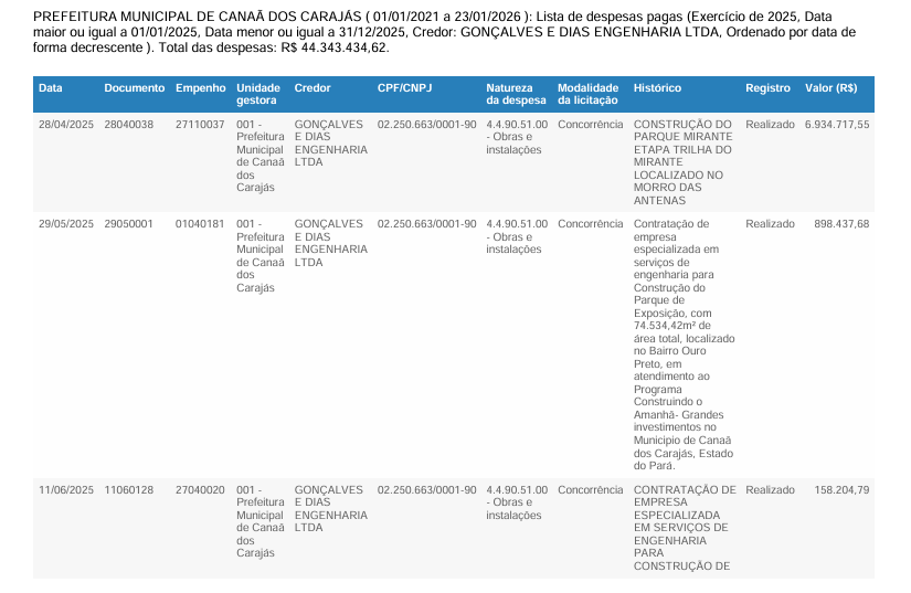 Dados oficiais de execução orçamentária mostram que os pagamentos já ultrapassaram os valores divulgados no canteiro da obra. Somente em 2025, os gastos classificados como “obras e instalações” ligados ao Parque do Mirante somam R$ 43.025.224,55. Em 2024, os pagamentos à mesma empresa atingiram R$ 14.915.154,77, considerando etapas e aditivos contratuais.