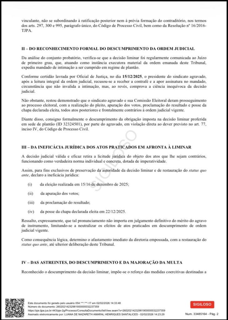 Diante do descumprimento, o TJPA declarou a ineficácia jurídica de todos os atos relacionados à eleição, incluindo a posse da diretoria, e determinou o afastamento imediato dos dirigentes empossados, com retorno ao status anterior até nova deliberação judicial .