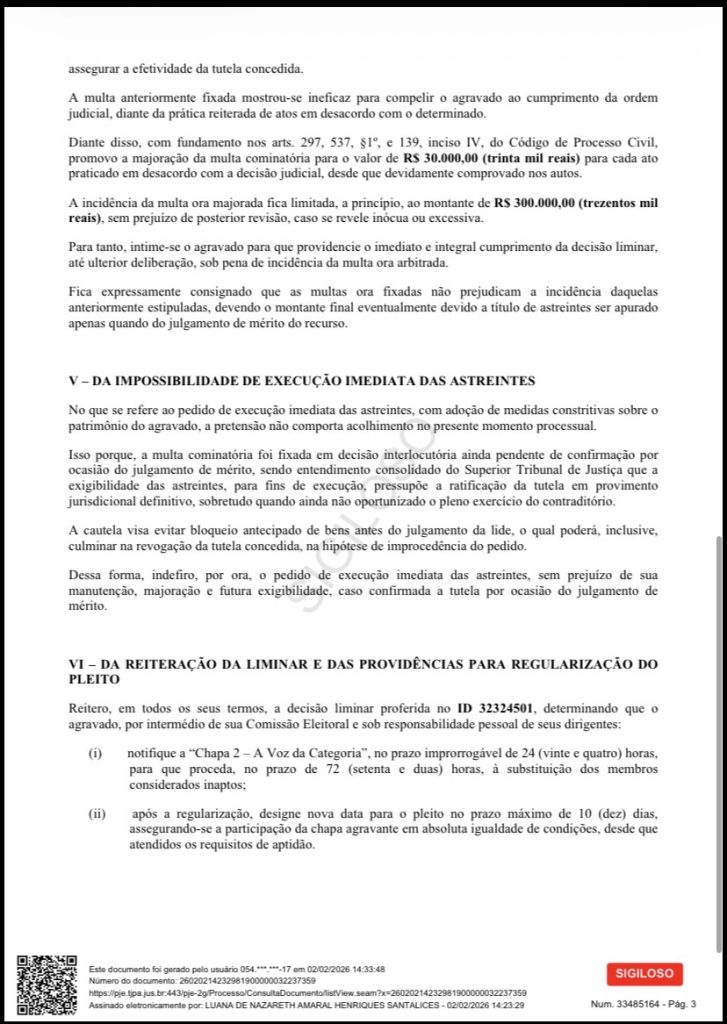 De acordo com a decisão, o presidente do sindicato foi formalmente intimado e, mesmo após a leitura integral da ordem judicial por um oficial de Justiça, recusou-se a assinar o mandado. Ainda assim, a Justiça reconheceu que houve ciência inequívoca da decisão.