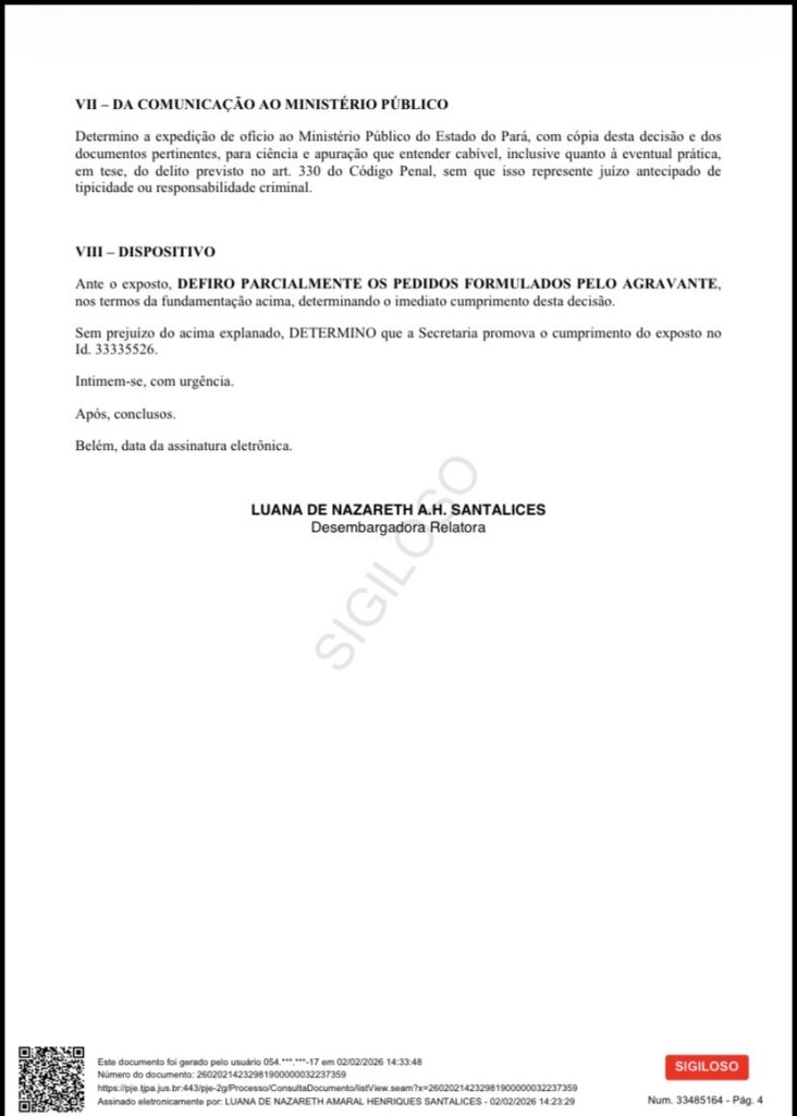 A desembargadora também majorou a multa por descumprimento para R$ 30 mil por ato, limitada inicialmente a R$ 300 mil. Além disso, determinou o envio do caso ao Ministério Público do Estado do Pará para apuração de possível crime de desobediência judicial (art. 330 do Código Penal) .