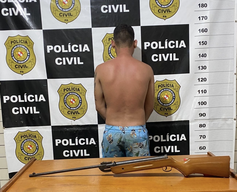 No momento da abordagem, o investigado portava uma espingarda sem identificação, o que resultou também em autuação em flagrante por porte ilegal de arma de fogo. Ele foi encaminhado à delegacia e permanece à disposição da Justiça.
