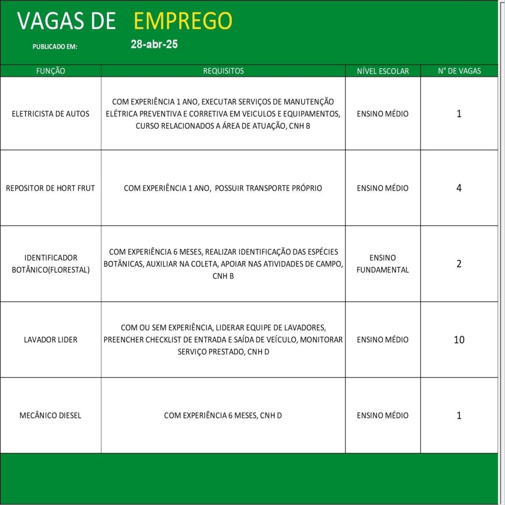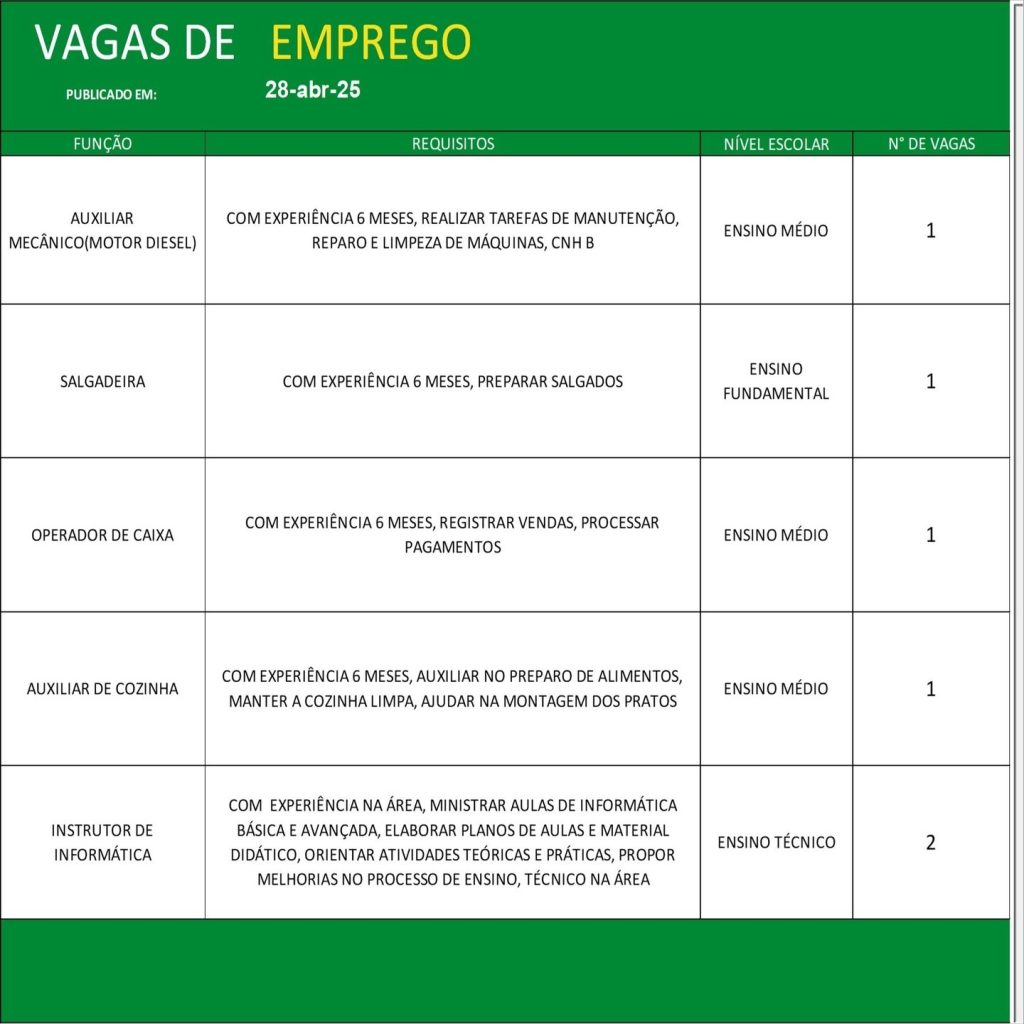 Entre os destaques estão vagas para Operador de Guindaste (leve, médio e pesado), Vendedor Interno e Externo, Auxiliar Mecânico (motor diesel), Salgadeira, Operador de Caixa, Auxiliar de Cozinha, Instrutor de Informática, Alinhador de Veículos, Mecânico Automotivo, Eletricista de Autos, Repositor de Hortifrut, Identificador Botânico, Lavador Líder, Mecânico Diesel, Mecânico de Refrigeração, Vidraceiro Montador, entre outras funções.