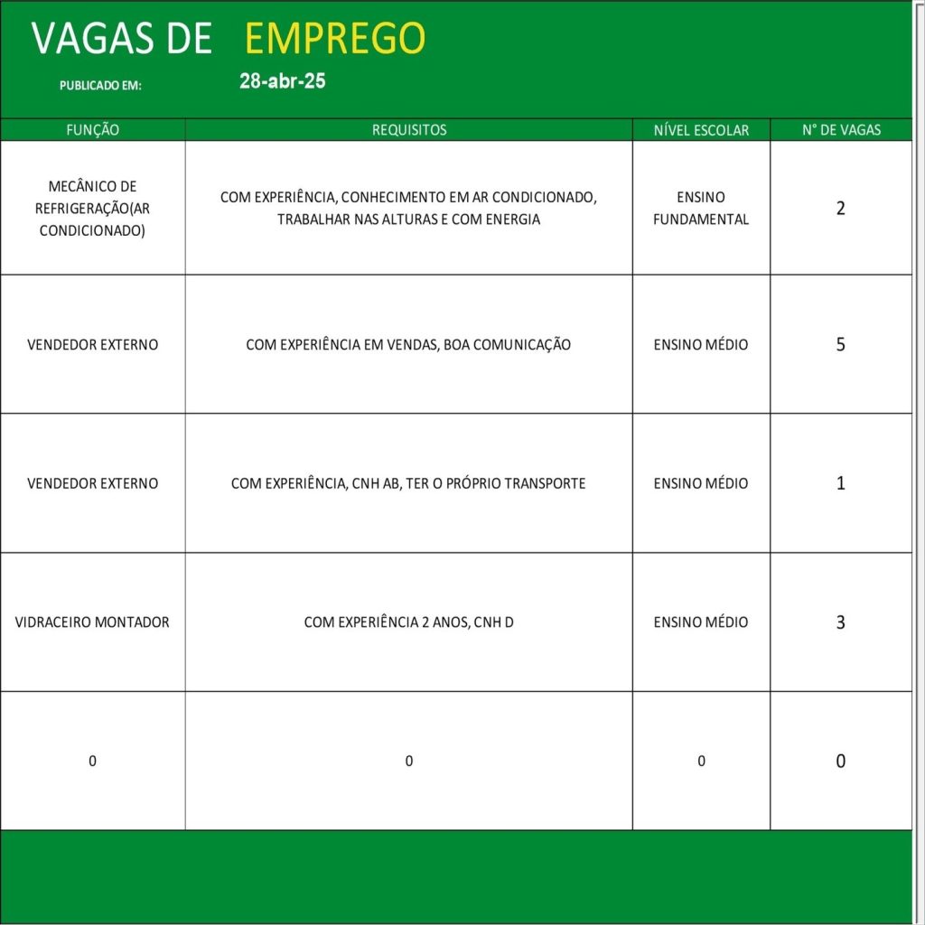 Acompanhe diariamente as atualizações do painel de vagas e não perca as oportunidades de conquistar uma colocação no mercado de trabalho formal. Para mais detalhes e informações sobre o processo seletivo, consulte o SINE ou o órgão de emprego responsável em sua cidade.