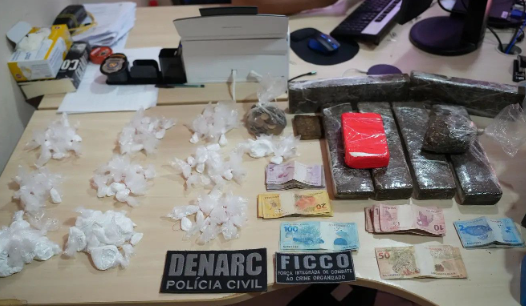 De acordo com o delegado Davi Cordeiro, titular da DENARC, uma mulher foi flagrada com seis tabletes e meio de maconha prensada, 94 porções e meio tablete de cocaína, além de dinheiro em espécie, sendo autuada por tráfico de drogas. Outro alvo foi preso por posse ilegal de munição.