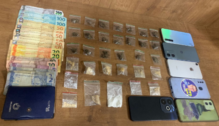 Dentro da casa, foram encontradas 5,6 g de cocaína, 18,3 g de maconha e 16,9 g de crack, todas as substâncias embaladas em invólucros tipo zip lock. Além das drogas, a polícia apreendeu R$ 773,00 em dinheiro e dois veículos.