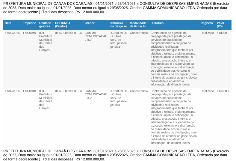 A Prefeitura Municipal de Canaã dos Carajás reservou, só entre janeiro e maio de 2025, a impressionante cifra de R$ 12.000.000,00 (doze milhões de reais) em empenhos destinados à Gamma Comunicação LTDA (CNPJ 04.672.859/0001-06), contratada para prestar serviços de publicidade institucional em nome da administração pública.