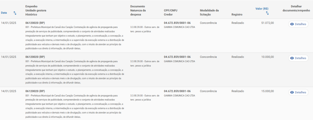 No dia 14 de janeiro de 2025, por exemplo, a prefeitura realizou mais de 30 repasses diferentes para a Gamma, com valores que variaram entre R$ 5.200 e R$ 85.000 — em sua maioria com descrições praticamente copiadas e coladas, sem qualquer detalhamento sobre campanhas realizadas, veículos de mídia utilizados, públicos-alvo alcançados ou resultados obtidos.