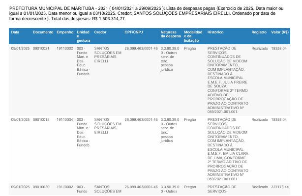 Quatro empresas se destacaram nos pagamentos. A Santos Soluções Empresariais Eirelli recebeu o maior montante, R$ 1.503.314,77, por serviços de videomonitoramento com implantação em escolas municipais, como a E.M.E.F. Julia Freire de Souza e E.M.E.F. Emilia Clara de Lima.