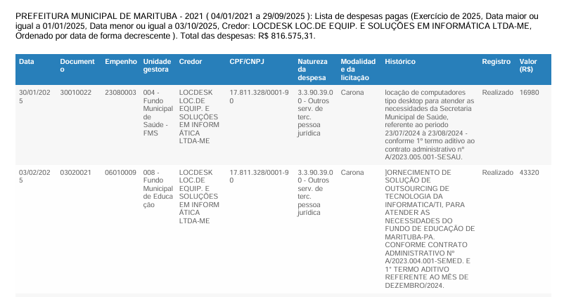 Fonte: Lista de despesas pagas em contratos de TI pela prefeitura de Marituba