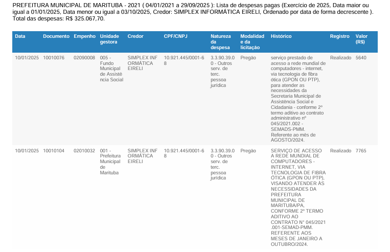 A Simplex Informática Eireli recebeu R$ 325.067,70 por acesso à internet via fibra óptica para diversas pastas, incluindo a Prefeitura, o Fundo de Saúde e a Assistência Social.