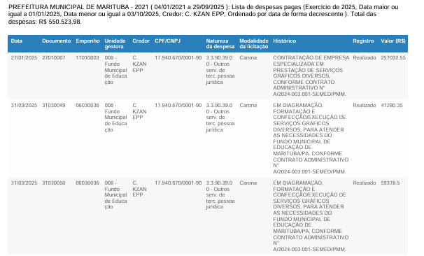 Por fim, a C. Kzan EPP teve despesas somadas em R$ 550.523,98 por serviços gráficos para as secretarias de Educação e Saúde.