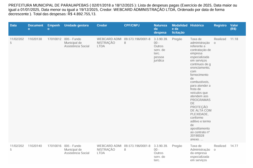 • WEBCARD ADMINISTRAÇÃO LTDA acumulou R$ 4.892.755,13 pagos diretamente pela Prefeitura no mesmo período, também vinculados à gestão informatizada do abastecimento da frota oficial.